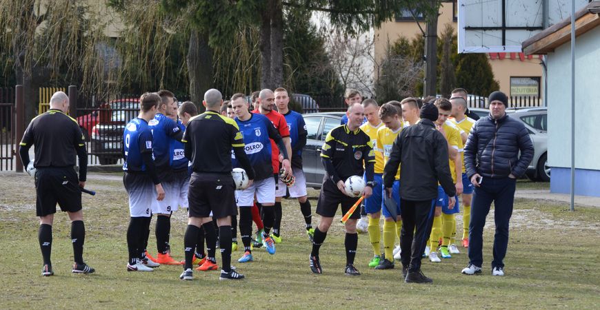 Potwierdziły się przedmeczowe obawy trenera Michała Osińskiego dotyczące przeziębień i kontuzji. W meczowej kadrze nie znalazł się chory Piotr Grzejdziak, a na ławce rezerwowych usiadł narzekający na uraz kolana Robert Piotrowski, dodatkowo za nadmiar żółtych kartek pauzować musiał Dariusz Dolewka. Biorąc pod uwagę powyższe absencje, zestawienie przede wszystkim linii defensywnej było nie lada wyzwaniem. Dodając do tego zawodników, którzy dołączyli do naszej drużyny w przerwie zimowej, w pierwszej jedenastce mieliśmy klika znaczących zmian w porównaniu z ostatnim meczem rundy jesiennej.